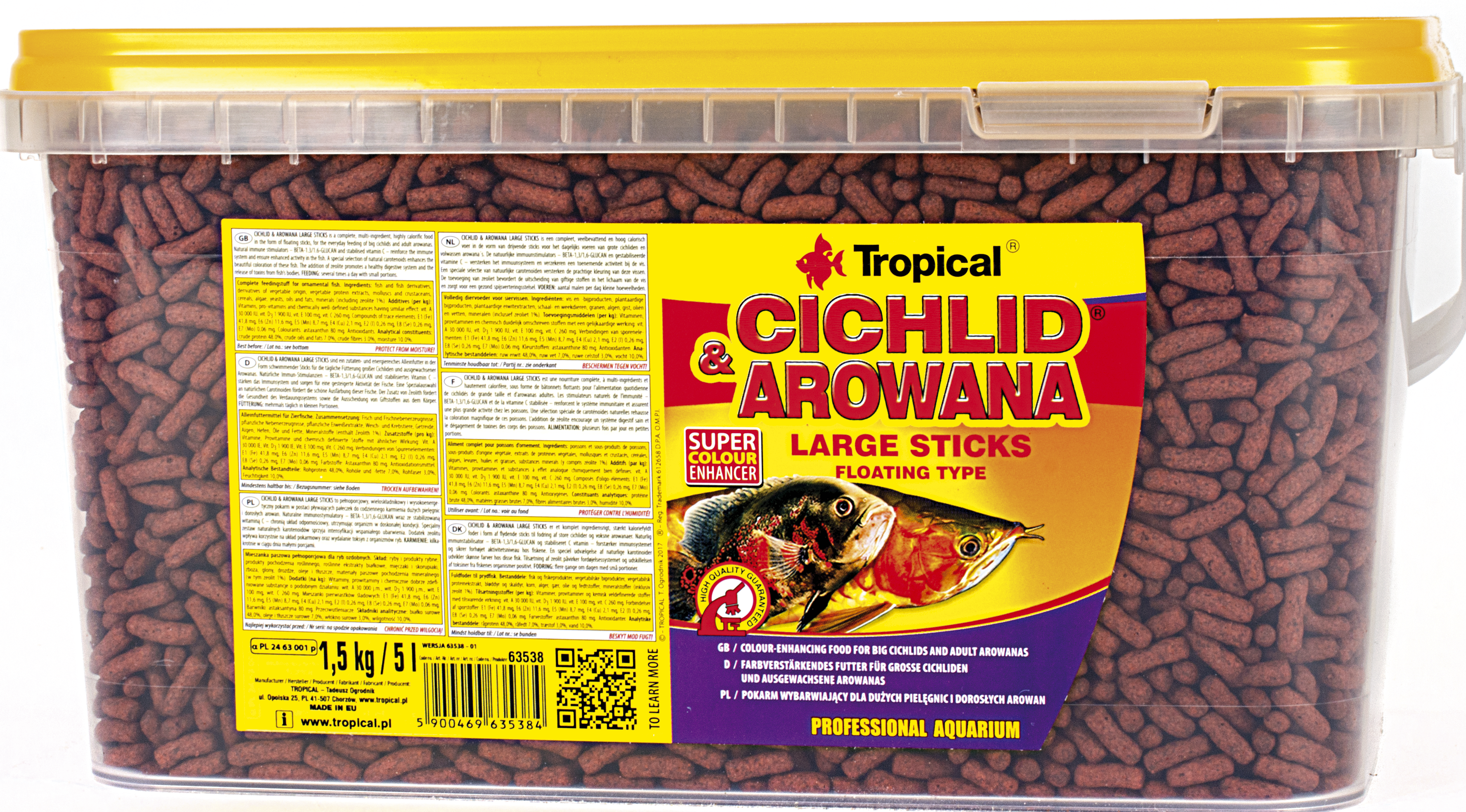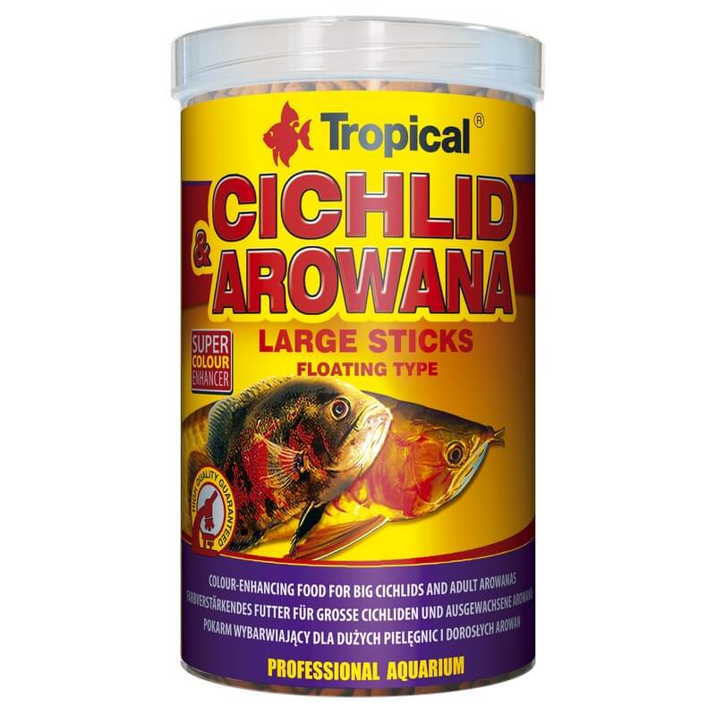 CICHLID & AROWANA LARGE STICKS TROPICAL un alimento en sticks, resaltador del color con astaxantina para cíclidos grandes y arowanas adultas. Un alimento multicomplemental resaltador del color en forma de sticks flotantes, destinado para la alimentación diaria de cíclidos grandes y arowanas adultos y otros especies de peces omnívoros y carnívoros que llegan a tamaños grandes. Cichlid & Arowana Large Sticks contiene un alto nivel de colorantes naturales, entre otros astaxantina de buena asimilación. Los colores de los peces alimentados regularmente con los sticks se intensifican y cogen reflejo. La proteína de fácil digestión y una serie de vitaminas y microelementos seleccionados de manera óptima favorece el crecimiento equilibrado y una condición perfecta de los peces. El sistema inmunológico queda activizado por vitamina C estabilizada y un inmunoestimulador fuerte – el beta glucano. Para variar la dieta de cíclidos medianos recomendamos también: Cichlid Spirulina Large Sticks, Cichlid Red & Green Large Sticks.