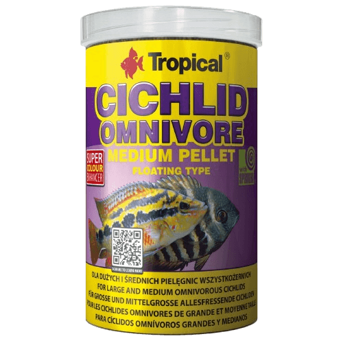 CICHLID OMNIVORE MEDIUM PELLET Alimento multi-ingrediente con astaxantín y spirulina para la alimentación diaria de cíclidos omnívoros grandes y medianos, e.g.: Archocenstrus sajica, Aequidens rivulatus, Heros severus. Los gránulos flotantes se elaboran con la tecnología HTST, gracias a la cual son excepcionalmente asimilables, biológicamente seguros y no se desintegran en el agua. Su rica fórmula satisface todas las demandas nuticionales de los peces omnívoros. Su alto contenido en fibra regula los procesos digestivos y los caratenoides realzan la coloración.